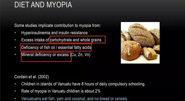 因为吃太多面包和谷物等精制淀粉含量高的食物,会增加胰岛素水平,影响眼球的发育,导致眼球发育异常并导致近视;