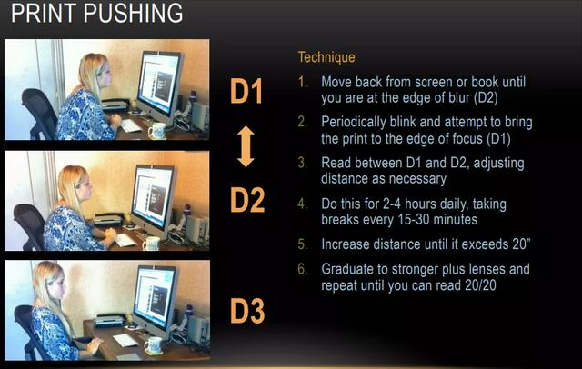 具体方法是这样的:从刚好可以看清楚的屏幕或书本距离(D1)开始,向后移动,直到开始处于模糊边缘(D2);开始眨眼,并试着将书本推到焦点边缘(D1);