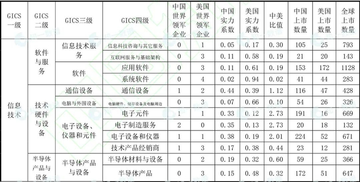 在技术硬件与设备二级产业,中国与美国的差距较小(中美比值0.40)。