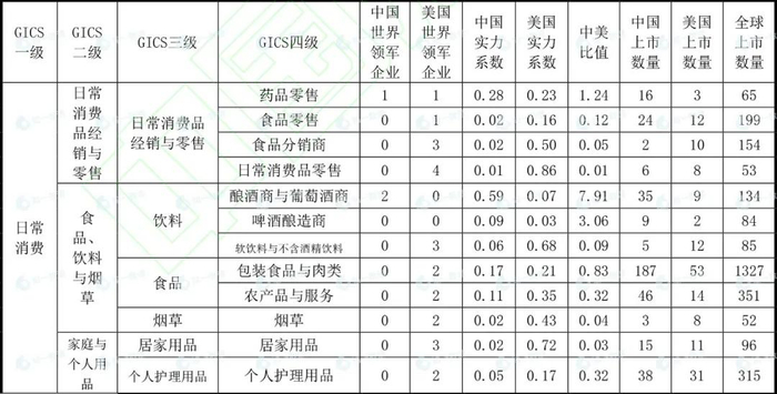 在其它5 个四级产业(食品分销商、食品零售、日常消费零售、居家用品、个人护理用品)中,中国拥有85家上市公司(占全球数量的10.4%),但全球市场占有率均不足5%,产业实力系数均不足0.1。