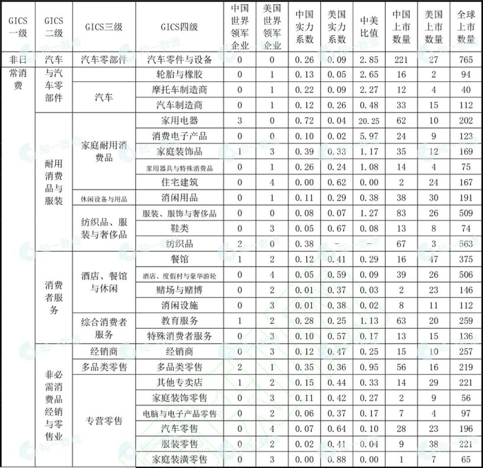 在二级产业日常消费品经销与零售(中美比值0.05)、家庭与个人用品(中美比值0.09)中国的表现则相对较弱,营收总额仅占全球的3%和4%。