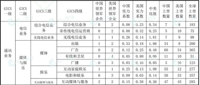在二级产业媒体与娱乐中的3个三级产业媒体(中美比值0.20)、娱乐(中美比值0.41)和互动媒体与服务(中美比值0.26),中国分别拥有1、1、2 家世界领军企业(含1 家世界冠军企业:互动家庭娱乐-网易),而美国分别拥有11、4、2 家世界领军企业(含5家世界冠军企业)。