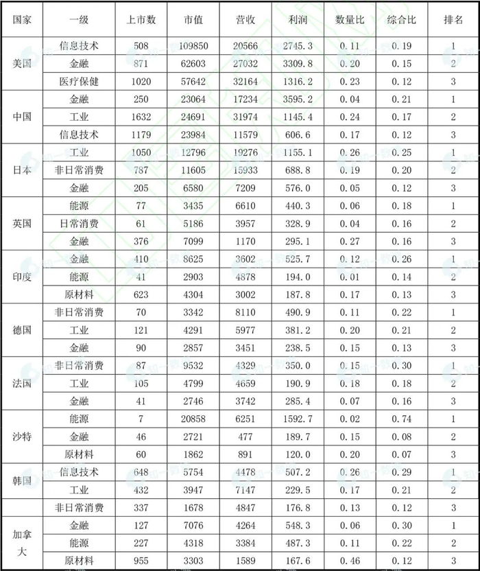 沙特这一资源型国家依靠能源产业的绝对地位在市值和利润占比中表现突出。加拿大和瑞士在市值、营收和利润占比中均保持一定竞争力,主要体现在金融、制造业和高端服务业等。