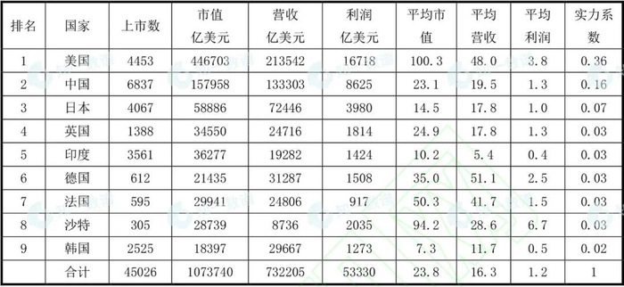 具体数据显示,美国上市公司的总市值为44.7万亿美元(占全球的42%),总营收为21.4万亿美元(占全球的29%),总利润为1.7万亿美元(占全球的31%),国家产业实力系数达0.36;