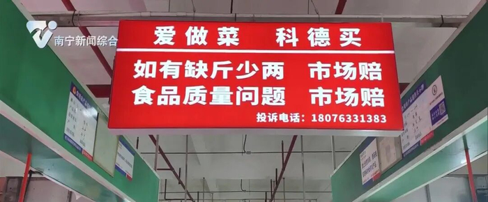12月24日上午,记者走进南宁高新区科德农贸市场,看到多处摆放着醒目的提示牌,上面写有“如有缺斤少两,市场赔”“食品质量问题,市场赔”。据了解,该市场设立了专项赔付基金,并明确了赔付范围、标准和流程,成为南宁市首个建立完整先行赔付制度的农贸市场。