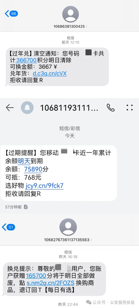 仔细看链接:诈骗短信的最终目的是诱导大家点击链接进入钓鱼网站,但其域名往往可疑,如网址异常短小,或者显示乱码。群众切勿直接点击,可通过官方渠道查询积分兑换信息。