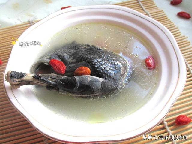 【清炖乌鸡汤】食材:乌鸡1只,枸杞,黄酒,葱段,姜片,盐少许,胡椒粉。
