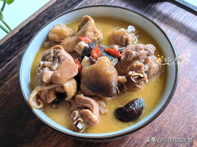 2,倒入开水,盖上盖子小火慢炖,炖大约45分钟倒入香菇,再炖十五分钟即可加盐调味,出锅后撒少许枸杞,上桌即成。