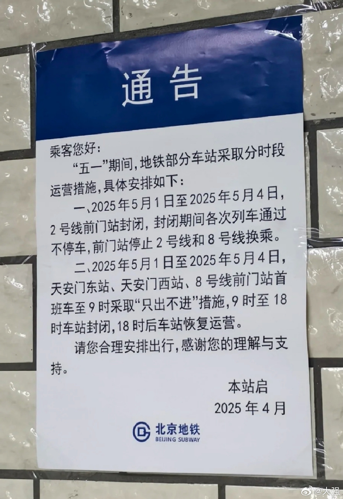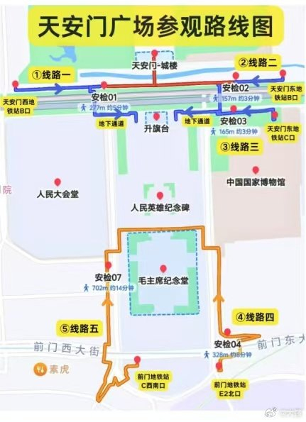 封站提示:五一期间地铁1号线天安门东/西站、2号线前门站临时封闭,建议优先选择金鱼胡同路线。
