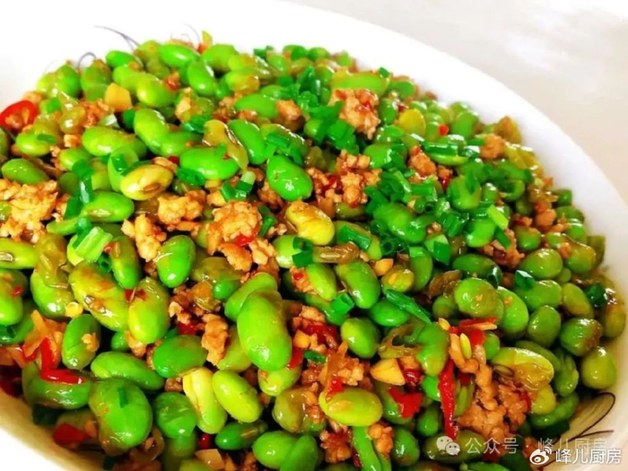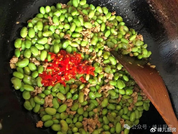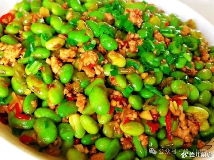 做法:1、毛豆洗干净备好,蒜,姜,切末备用。2、锅热油滑锅,下入肉沫炒散。3、炒散下入姜沫,蒜沫。4、爆香,倒入生抽翻炒均匀,下入毛豆翻炒。5、待变色,加入半碗清水,盖锅盖闷煮2分钟,加入一勺剁椒,翻炒均匀。6、待翻炒均匀,加入盐,鸡精即可起锅,撒一点葱花就可以上桌了,超级下饭。