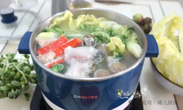 做法:1、大骨泡去血水,放入砂锅,加葱姜大火烧开,改成小火熬成一锅乳白色的汤,用来做火锅底汤,营养好味道鲜美。2、火锅洗净,加入熬好的大骨汤烧开,加入适量葱姜蒜。3、金针菇菌菇洗净,放在盘里,西兰花洗净改刀,牛肉丸子、燕饺、蟹棒摆盘。4、草鱼洗干净片成鱼片,用红薯淀粉和蛋清抓匀,腌渍片刻放入盘中。5、芝麻酱2勺,蚝油2勺,沙茶酱2勺,加入1勺醋,1勺生抽搅拌均匀。再把红椒切末,葱切末分别装入碗中,自制辣椒油也放入小碗,喜欢啥就可以自己往蘸酱里面添加。6、汤煮开后,把食材放入火锅,煮透后,改成小火,吃时候点击升降键,不用捞,捞,捞,嫩嫩的鱼片也一样不再需要漏勺,轻松升降真省劲!