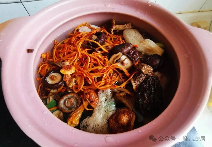 做法:1、菌菇包里面有羊肚菌,竹荪,香菇,茶树菇,虫草花,赤松茸,鹿茸菌,姬松茸多种比较好的菌类,提前用水泡一下。2、把鸡剁成块,焯水洗去浮沫,放入砂锅中,大火煮开。3、把各种菌菇清洗干净,放入砂锅中,小火慢慢地炖大约40分钟。4、炖好的鸡汤,加入适量的盐调味即可。各种菌菇都带有独特的鲜香味,尤其是经过烹饪之后,味道是鲜美。