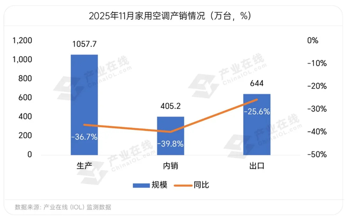 据产业在线监测数据显示,2025年11月中国家用空调生产1057.7万台,同比下滑36.7%,销售1049.2万台,同比下滑31.8%,其中内销规模405.2万台,同比下滑39.8%,出口规模644.0万台,同比下滑25.6%。中国家用空调市场整体表现持续低迷,受到政策红利消退后需求的疲软,以及海外库存高企去化周期的拉长等阻力因素,叠加同期高基数压力,内外销市场双双承压下滑。