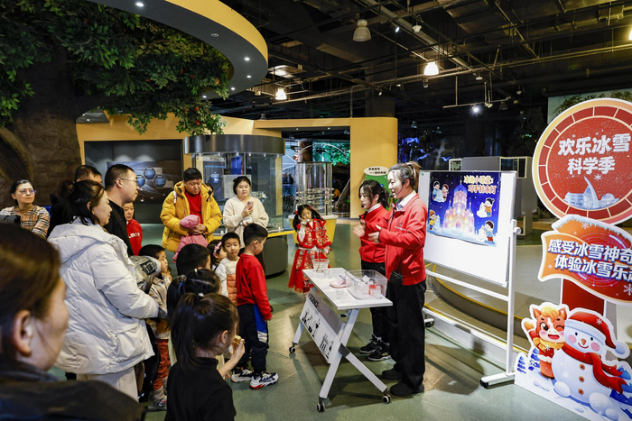 “冰雪科学秀”活动让公众感受冰雪神奇新年特别活动更是人气爆棚、精彩纷呈。“科技非遗 印记新年”活动现场,多组亲子家庭围桌而坐,以环保宣纸为笺、天然彩墨为媒,拓印植物纹理之美,让古老非遗技艺与自然科学精妙交融;三层水世界展区的“冰趣小课堂”上,小学生们轻触通透冰料,在科技老师的生动讲解中洞悉冰的导热特性,亲手打造专属迷你冰灯,沉浸式感受冰雪文化的独特魅力。中厅的冰雪科学秀堪称全场“人气王”,趣味冰雪小实验现场“造雪”,漫天飞舞的“雪花”营造出唯美梦幻的氛围,引得游客们纷纷举起手机定格这一神奇瞬间。“在室内亲历‘下雪’,还能学到满满的科学知识,太奇妙了!”游客们赞不绝口。