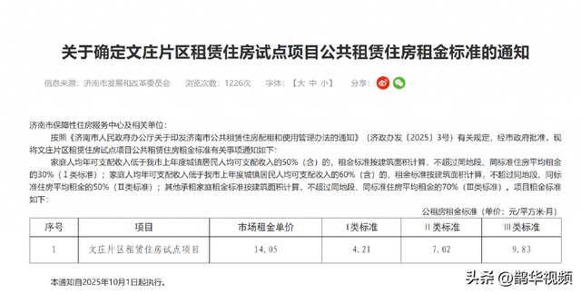 近日,济南市发展和改革委员会、济南市住房和城乡建设局、济南市财政局三部门联合下发通知,确定文庄片区租赁住房试点项目公共租赁住房租金标准,最低价为4.21元/平方米·月。通知自2025年10月1日起执行。