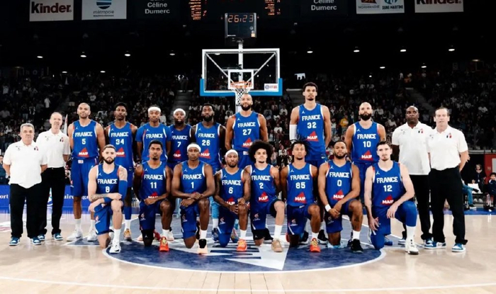 身高7尺的鲁迪-戈贝尔站在文班亚马身边都小了一圈,这套法国队文班亚马是四号位,戈贝尔是五号位,不得不说尺寸无敌,关键文班亚马是一个能有希望打四双的球员,他就是建模BUG。