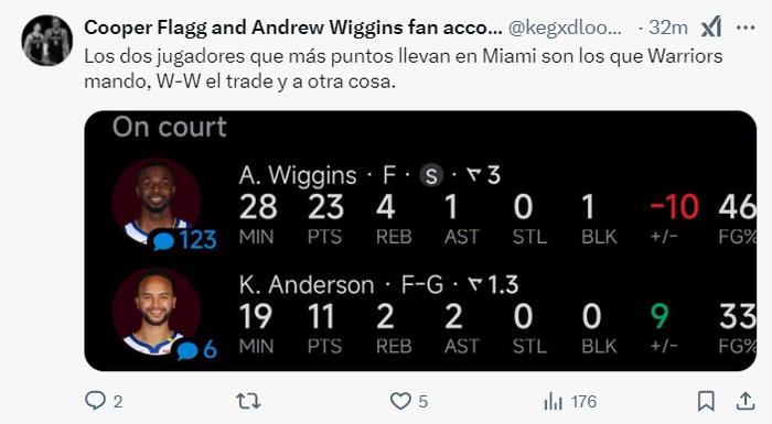 希罗全场比赛19中4+三分9中0拿11分5失误;阿德巴约13中5拿14分4失误;韦尔8分15篮板,这场比赛热火的两大核心一同拉胯,威金斯成为唯一的亮点,可这样的比赛最终威金斯还是得背锅,因为他换走巴特勒,巴特勒去勇士是1胜5负。