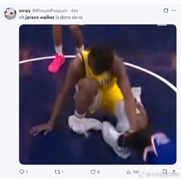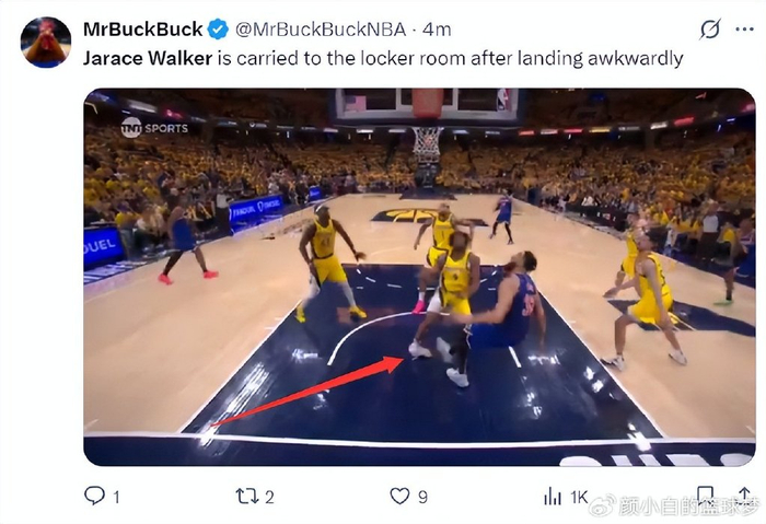 沃克这次防守后就直接倒地了,步行者拿球反击失误后尼克斯快攻上进,沃克还在地上,随后卡莱尔才叫暂停队医进入场内。