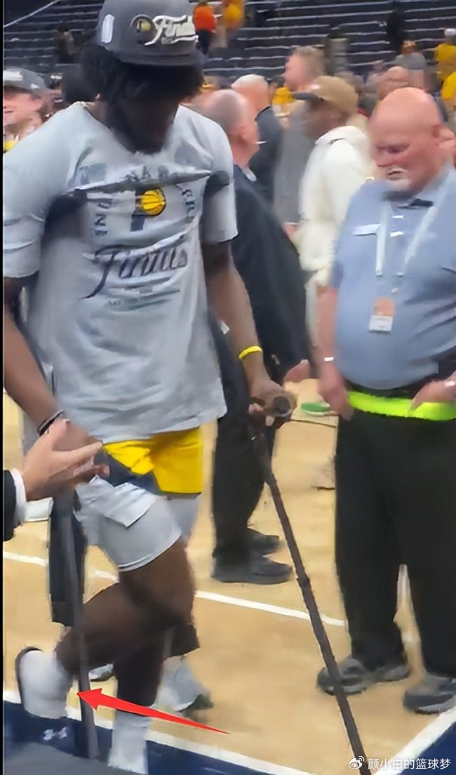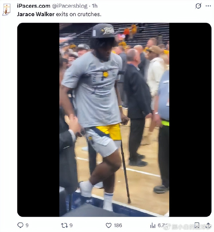 步行者拿下胜利后进行颁奖典礼,沃克是拄拐参与,他的右脚是完全不能负重的状态,因为沃克不是大牌球星甚至不是步行者先发主力,所以美国多位医学专家都没有去分析他这个崴伤要休息多久。