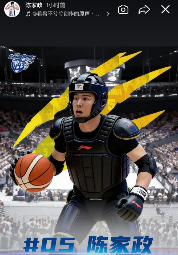 陈家政在个人社媒发布了一张全副武装打球的PS图,暗示被多次下黑手。