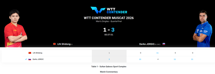 WTT马斯喀特常规挑战赛1/4决赛,1-3惨败约奇克(世界排名15);