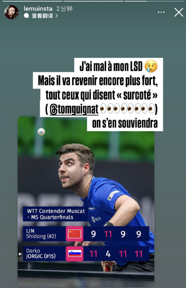 在林诗栋连续被爆冷后,法国解说员发布IG:我的林诗栋输球我好难受,但他一定会卷土重来,变得更强。那些说他被高估的人,我们走着瞧。