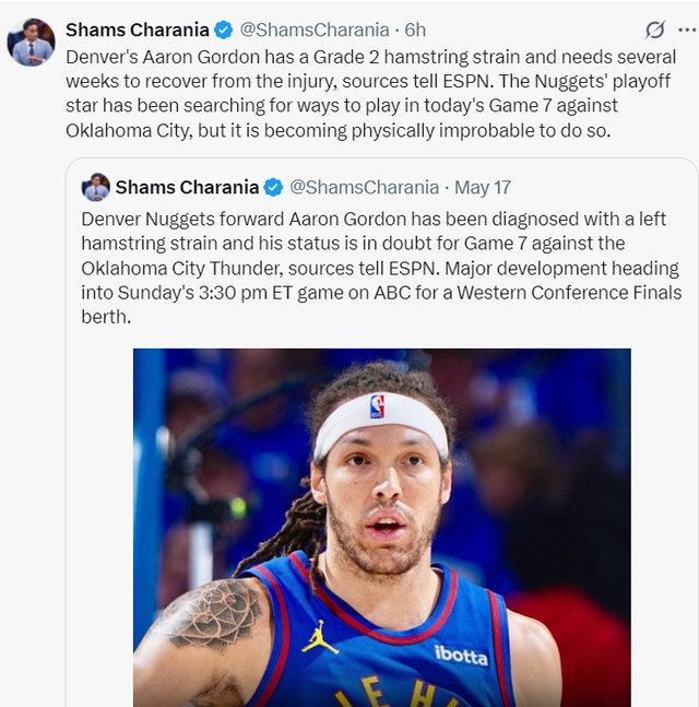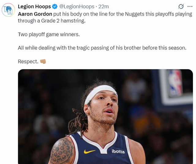 美媒LH报道:在本次季后赛中,阿龙-戈登为了掘金队不惜以自己的身体冒险,尽管他遭遇了二级腿筋拉伤的伤病。与此同时他还一直承受着本赛季之前其哥哥离世所带来的悲痛(2024年6月份车祸),致敬。
