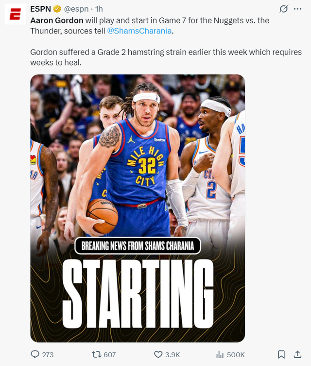 赛前掘金官方宣布戈登会带着左腿筋拉伤坚持出战,戈登也直接登上了全美第一热搜,因为所有人都知道库里左腿筋一级拉伤都休息了足足四场比赛没有打,最终算是提前赛季报销,而戈登是二级拉伤。