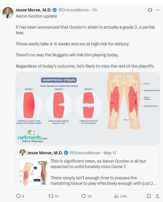 医学专家Jesse Morse透露腿筋二级拉伤等同于肌腱部分撕裂,他这么严重的伤势掘金队不可能允许他登场,因为有造成职业生涯报销的风险。戈登就这样还是出战了。