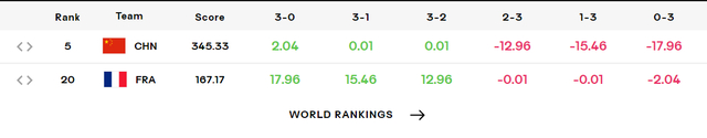 这场比赛中国队3-0法国队拿到+2.04分,那么中国队就是345.33+2.04=347.37分继续排在世界第五的位置。
