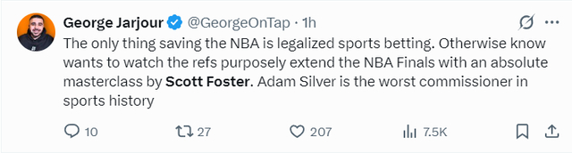 美记George Jariour写道:唯一能拯救NBA的就是合法的BC,否则不可能看到主裁判刻意延长总决赛,福斯特是大师级的,萧华是体育史上最糟糕的总裁。