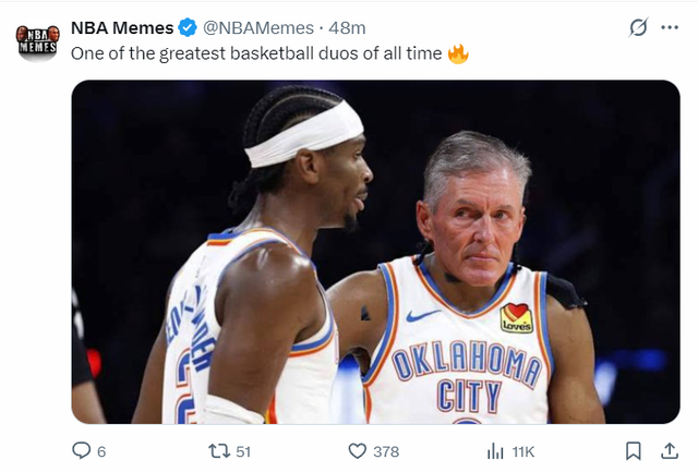 美媒NBA Memes继续嘲讽:亚历山大+福斯特才是NBA历史上最伟大的组合。(福斯特是SGA最好的帮手)