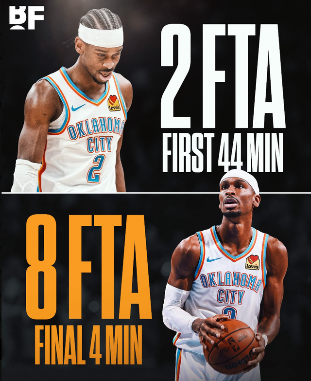 这场比赛裁判的吹罚尺度再度引发热议,SGA前44分钟只有2个罚球,可最后4分钟有8个罚球,最终雷霆38罚超过步行者33罚,杰威与SGA两人的罚球都超过了10次。