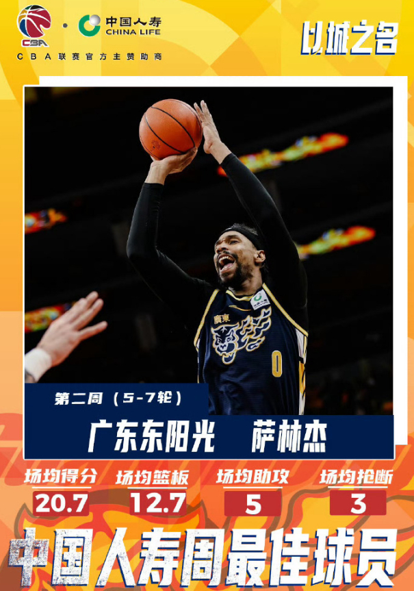 萨林杰第二周场均20.7分12.7篮板5助攻3抢断,成为周最佳球员。
