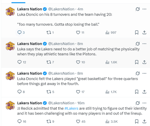 雷迪克认为失误、对手的内线得分、快攻杀死了湖人队。东契奇谈到自己的八次失误表态,失误的确太多了,我该确保自己的传球不要出界,湖人打了三节好球可在第四节却崩盘了。