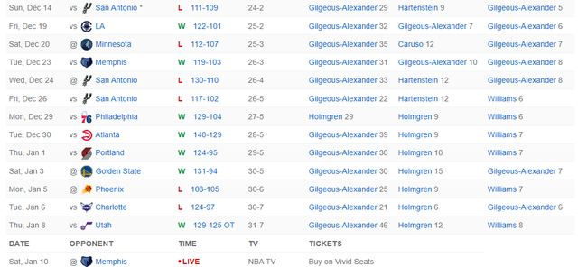 北京时间1月10日,NBA常规赛,雷霆以117-116逆转灰熊拿到二连胜。首节雷霆就落后10分,半场雷霆落后到19分,三节打完雷霆还落后13分,末节雷霆打出了36-22的攻防浪潮完成了逆转,雷霆残阵在落后21分的情况下逆转了灰熊。
