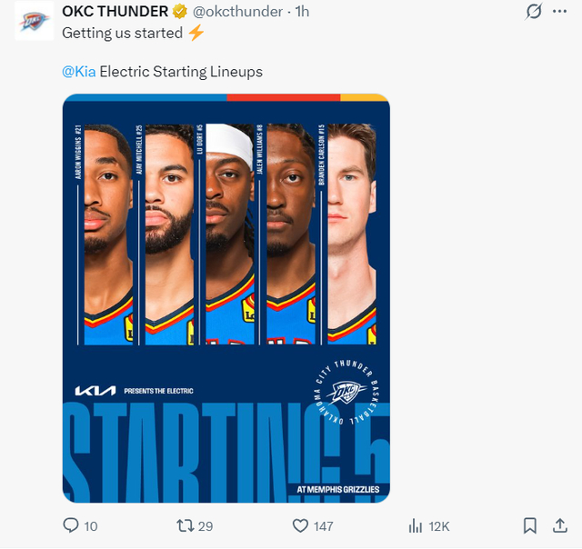 上半场灰熊最多时领先雷霆21分之多,雷霆是防守效率联盟第一的球队,可上半场还是让灰熊拿到65分这已经说明没有SGA的雷霆判若两队。杰威、米切尔、威金斯、多尔特、卡尔森的先发阵容进攻效率也不佳,尤其是球队第二巨头杰威没有什么进攻的欲望。