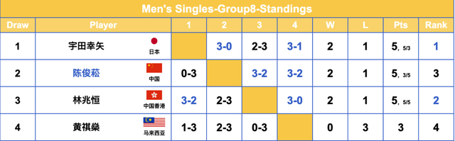 G8组,国乒小将陈俊菘2胜1负但因为算小分被淘汰,小组第一是日乒名将宇田幸矢2胜1负,小组第二是林兆恒2胜1负,这两人都是以小分晋级,陈俊菘不敌宇田幸矢那场太致命。
