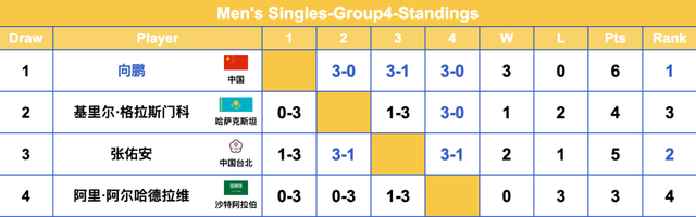 G4组,向鹏以三连胜锁定小组第一,两场3-0与3-1;小组第二的张佑安2胜1负晋级16强。