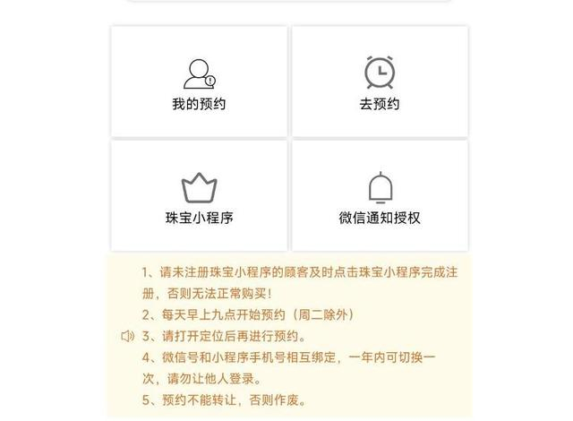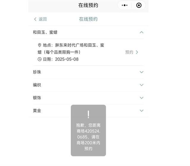 8日晚,极目新闻记者也尝试用“胖东来珠宝预约小程序”进行线上预约,可在线预约和田玉及蜜蜡时一直失败,提示“请在商场两百米范围内预约”。该小程序中还提到,未注册珠宝小程序的顾客,需要完成注册,否则无法正常购买。且每天早上9时开始预约(周二除外),并需要打开定位,预约不可转让,否则作废。