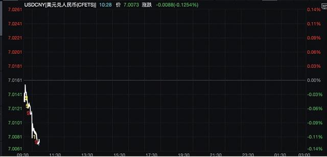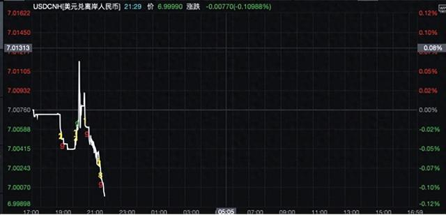 Wind数据显示,截至25日10:29,离岸人民币对美元汇率报6.9999元,较前收盘价上涨77个基点,盘中最高报6.9981元,升破7元关口。