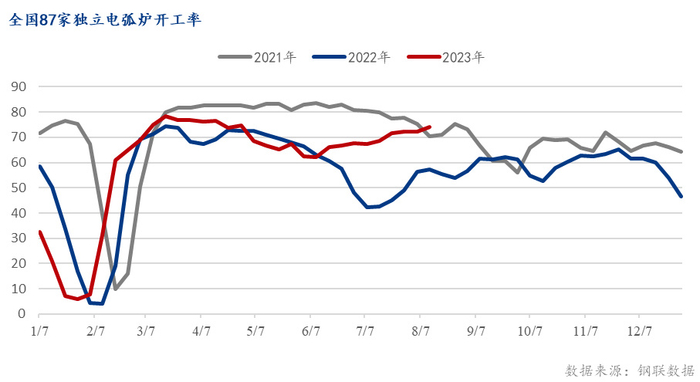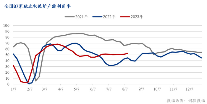 在去年高温事件影响下,今年6月底多地即出台一系列有序用电文件,因此多省份电炉厂在6月底、7月初开始采取有序用电措施,减少生产时间,其中部分电炉厂迫不得已选择停产。之后随着台风天气来临,降水增多,高温天气不似往年严酷,有序用电措施逐步取消。随之而来的是粗钢平控消息频发,要求产量同比2022年或2021年不能出现增加,电炉厂作为灵活代表首当其冲,部分开始小幅减产,但因去年基数水平偏低,钢厂当前生产效率已经偏低,因此整体影响偏小,大幅减产钢厂较少。受四川举办大运会事件影响,川渝地区电炉厂压产直至停产,产能利用率出现明显下降。综上所述,在多因素影响下,电炉厂产能利用率处于低位,波动幅度较小。
