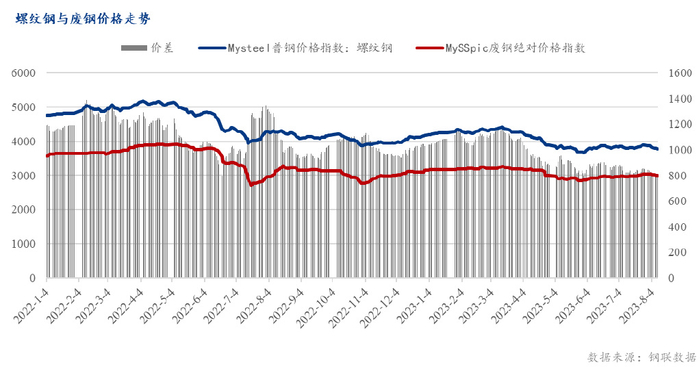 从Mysteel跟踪的螺废差数据来看,截至8月9日,螺废差仅为788.58元/吨,环比减少35.49元/吨,同比减少466.9元/吨,而这一数字在7月维持在814.82元/吨以上,因此可以看出螺纹钢与废钢价差不断缩小。从电炉钢成本分析来看,根据周度调研电炉成本指标,按照3000元/吨的绝对废钢价格、吨钢耗电450kwh/t、辅料及燃气160元/吨,30公斤的合金消耗量等综合情况进行成本粗略核算,其螺纹钢制造成本大约为3900元/吨,建筑钢材电炉厂平均利润为-119元/吨左右,基本处于亏损水平。现在电炉为国家鼓励发展炼钢方式,绝大多数电炉厂享受补贴、税收优惠等政策,因而成本有进一步下降的可能性。