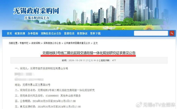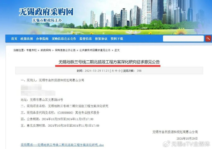 无锡地铁3号线二期北延新消息: