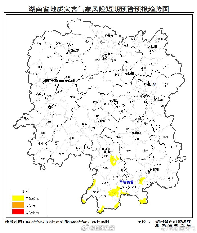 #湖南省地质灾害气象风险预警#【预计5月28日20:00至29日20:00湖南南部郴州永州等市州山地丘陵区发生突发性地质灾害风险较高,请做好防范~~】根据地质灾害成灾规律和孕灾条件,结合2025年5月28日短期气象预报情况,省自然资源厅与省气象局联合会商得出如下结论:自5月28日20:00至29日20:00,受降雨影响, 湘南的郴州、永州等市州山地丘陵区发生突发性地质灾害风险较高黄色预警。