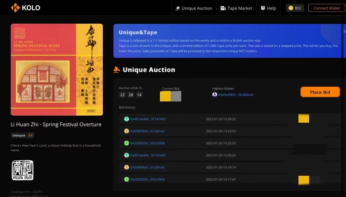 近期,行业中涌现了众多音乐项目,网易、腾讯等纷纷推出其音乐数字藏品。专注于古典音乐的库客音乐集团(KUKE.US)投资的数字艺术藏品平台KOLO,在农历新春之际上架数字艺术藏品专辑《春节序曲》,发行仅短短几小时,引来火热关注。