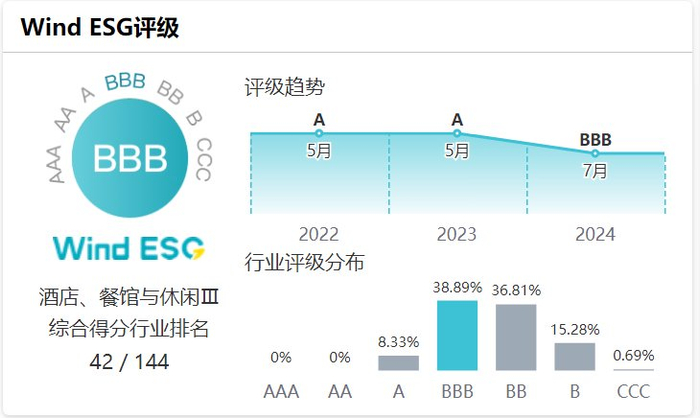 根据万得最新ESG评级,海底捞的评级从2023年的A级下滑至2024年的BBB级,公司在环境、社会和治理三个维度上的评分均显著低于行业领先水平。从海底捞的实际表现来看,其在社会与治理维度仍存在较大的提升空间。
