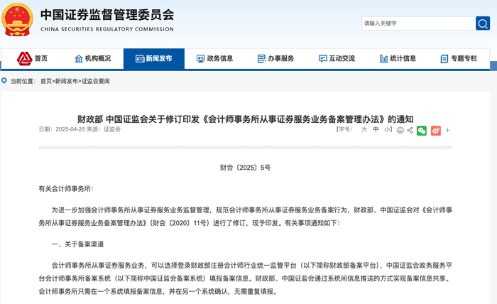 据中国证监会网站4月25日消息,为进一步加强会计师事务所从事证券服务业务监督管理,规范会计师事务所从事证券服务业务备案行为,财政部、中国证监会对《会计师事务所从事证券服务业务备案管理办法》(以下简称《办法》)进行了修订,并予印发。