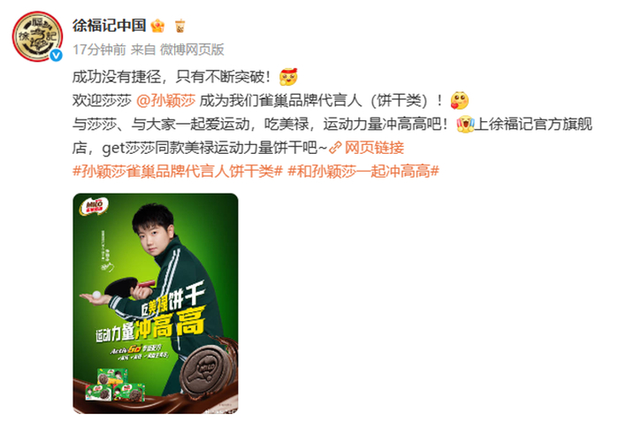 5月15日,徐福记正式宣布中国乒乓球运动员孙颖莎成为雀巢品牌代言人(饼干类)。当日,“和孙颖莎一起冲高高”“孙颖莎不断超越自我”“孙颖莎坚持热爱追逐信仰”等互动话题登上微博热搜。