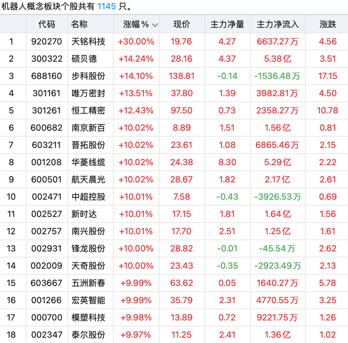 截至上午收盘,天铭科技(920270)(“30cm”涨停)、南京新百(600682)、晋拓股份(603211)、华菱线缆(001208)、航天晨光(600501)、中超控股(002471)、新时达(002527)、南兴股份(002757)、锋龙股份(002931)、天奇股份(002009)、五洲新春(603667)、宏英智能(001266)、模塑科技(000700)、泰尔股份(002347)等14只机器人概念股涨停。其中,锋龙股份达成5连板,天奇股份、泰尔股份4连板。